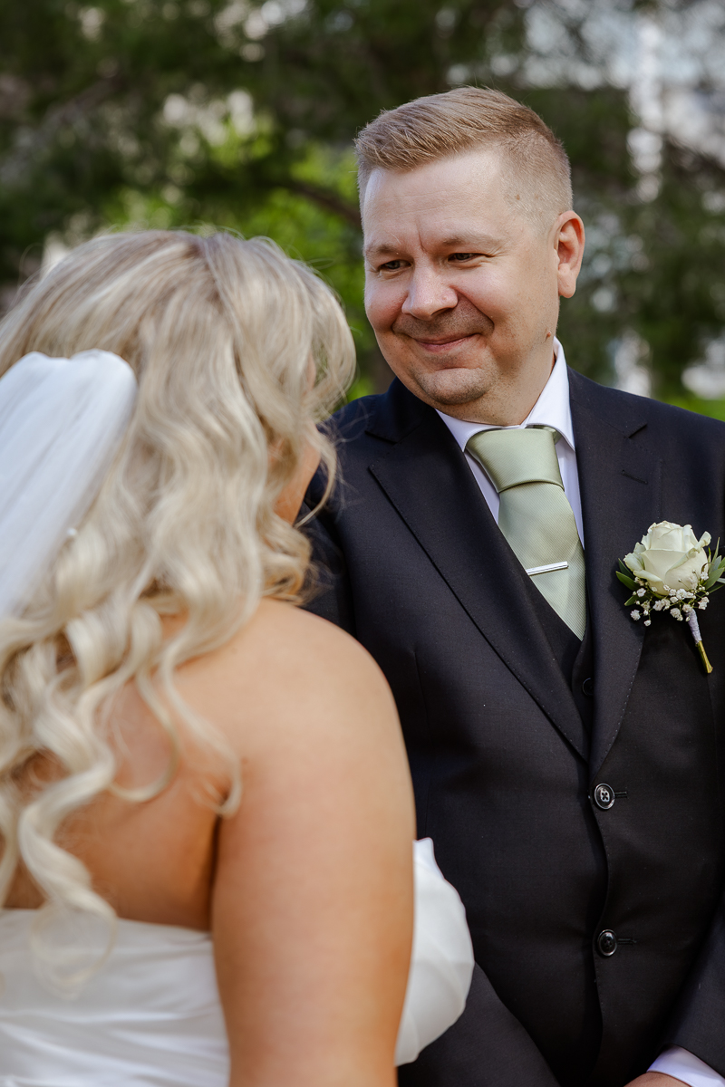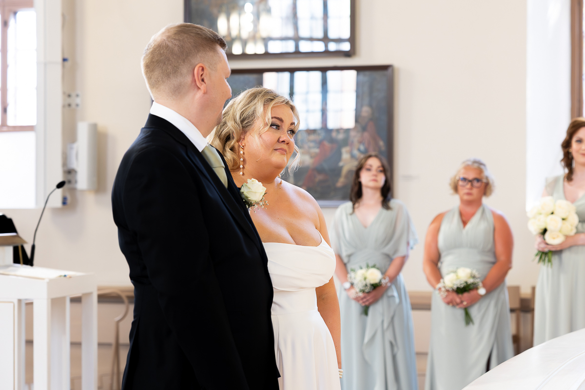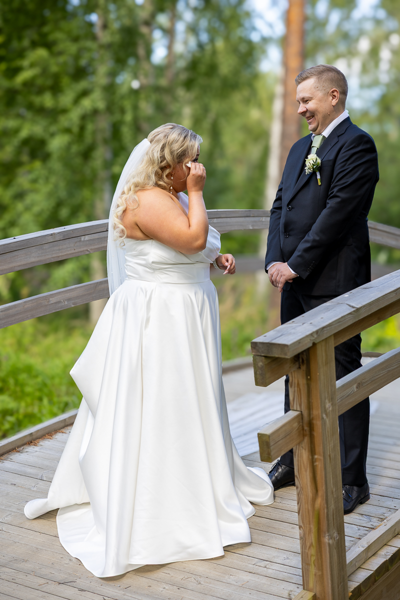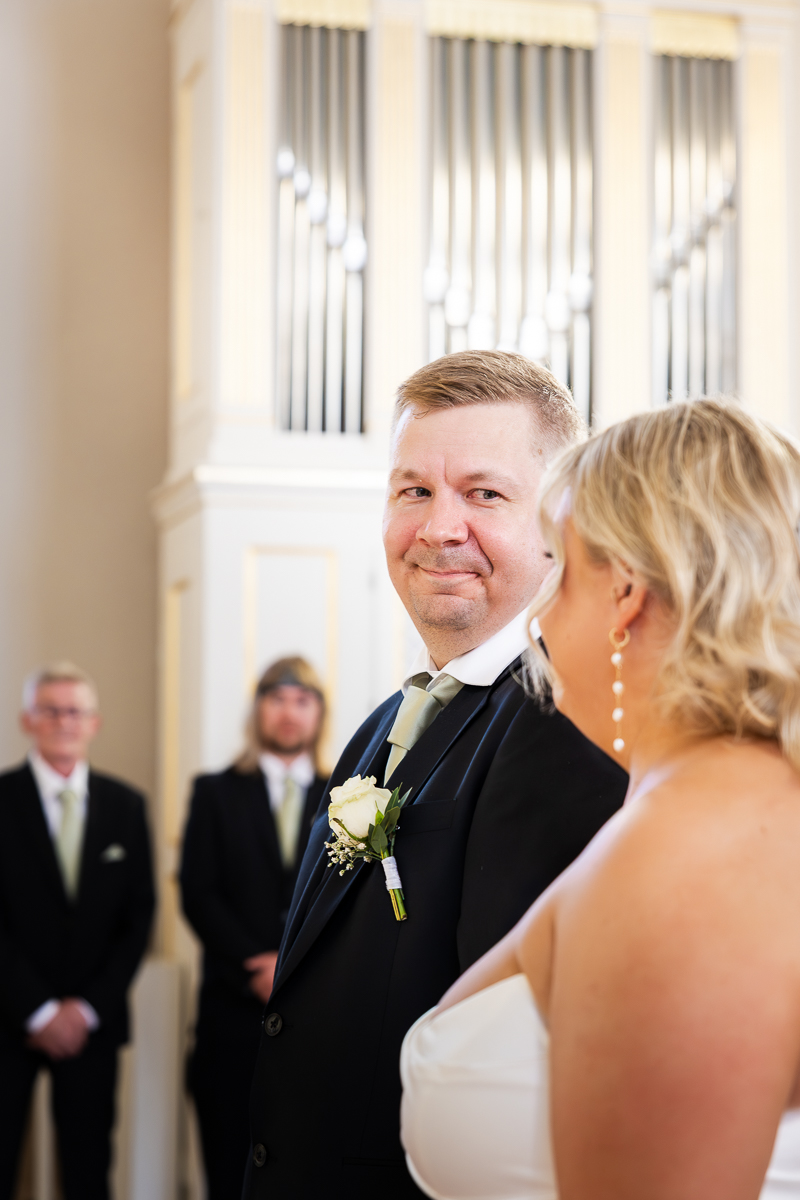 Useimmiten liityn hääpäiväänne mukaan viimeistään ennen vihkimistä. Sovimme ennakkoon, kuvaammeko First Look -kuvia vai tapaatteko ensimmäisen kerran esimerkiksi alttarille kävellessänne. Vihkimisestä ikuistan teille kuvat koko vihkikaavan matkalta aina alttarille kirkon portailla hurraamiseen, juhlakansan tunnelmia unohtamatta. Tiedän tarkalleen missä ja milloin olla kameroideni kanssa. Hääkuvauksessa käytän aina kahta ammattitason kameraa erilaisilla objektiiveillä. Kuvat tallennetaan aina useammalle muistikortille, näin minimoidaan riskit kuvien tuhoutumisesta. Vihkikuviin teille jää muistoiksi niin tunteikkaita hetkiä, yksityiskohtia, kuin laajempia yleiskuviakin.